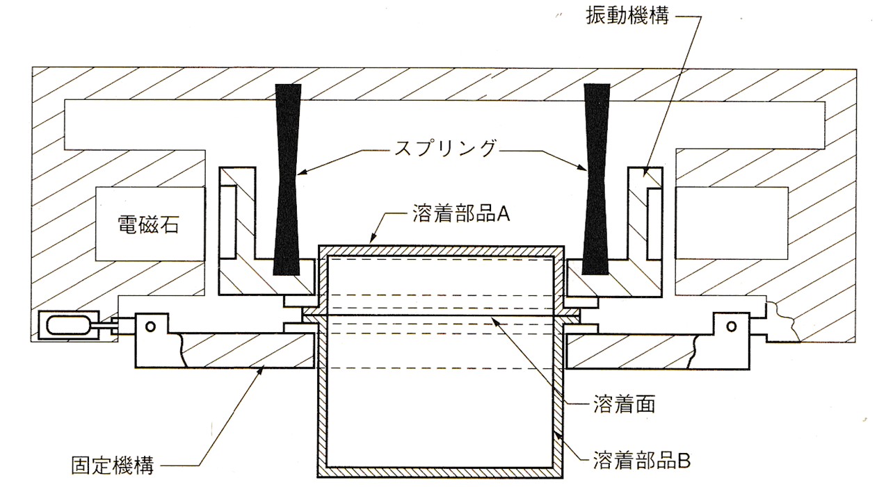 例えば回転摩擦溶接では直径10cmの被着体を、1000rpmで接合していたとする。これを振幅10㎜(実際にはもっと小さい)で同様の発熱を得ようとすると振動数を10万回/分(1500Hz)となり、実現するためには高度な技術が必要だ。図16のような電磁的駆動はその例だ。