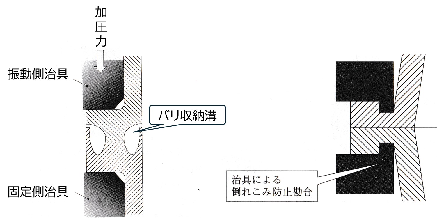 振動溶着では溶着面にせん断応力が働く。溶着部の幅と運動振幅が近いこともあり、溶接部が変形することがある。図20右のように治具を工夫して変形を防ぐことが行われている。バリ除去も課題になる。バリの問題が外観だけの場合は図20左のようにバリをかくすためリブを溶着部側面に設けることもある。