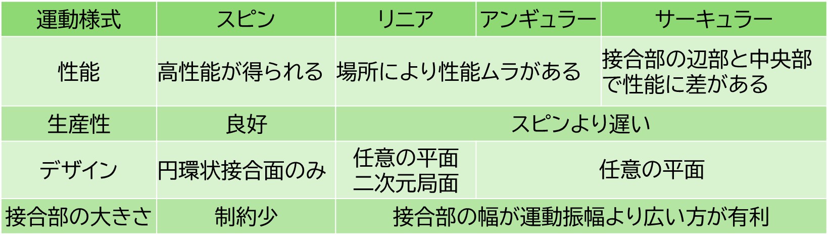 スピンウエルドは性能、生産性、適用寸法範囲などが優れている。しかし、溶着面が円環状の場合に限られる。円環状溶接面が取れない場合は振動法を検討することになる。その中でリニアは2次元曲面が取れること、サーキュラーは運動方向による性能差がないという特徴がある。