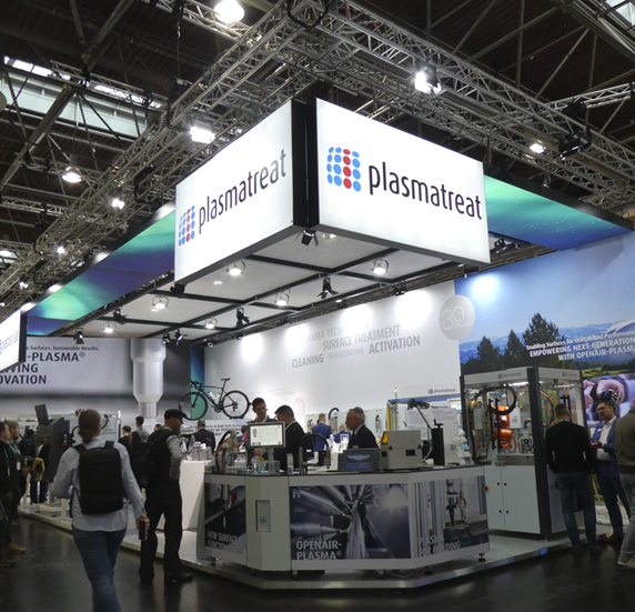 プラスチック等の表面処理装置であり、かつ、ロボットでのデモンストレーションで目立っていたドイツのPlasmateat 社の展示を紹介する。