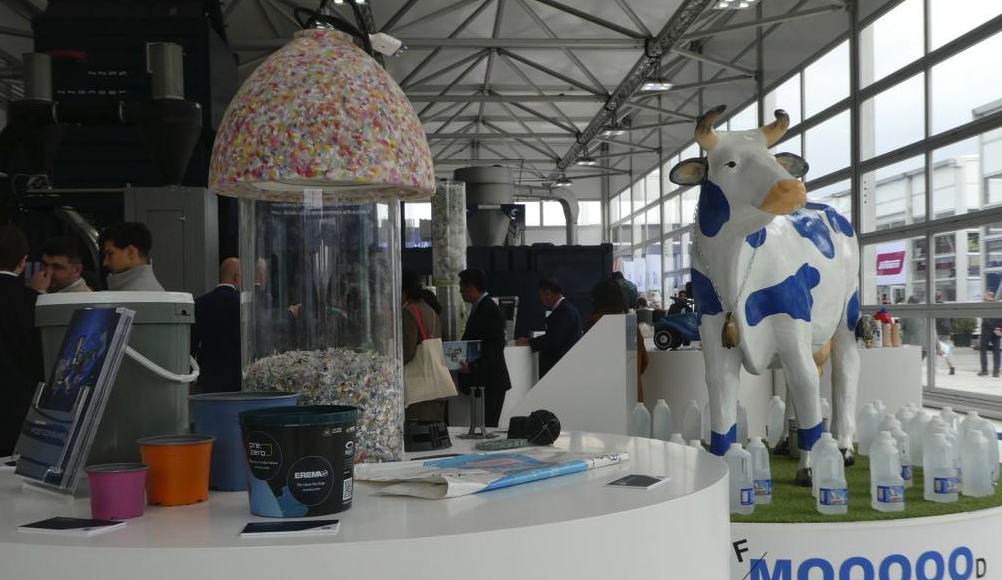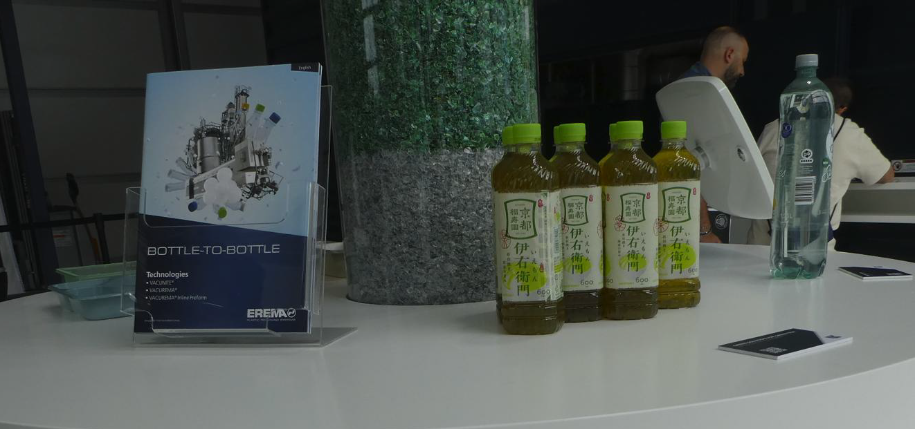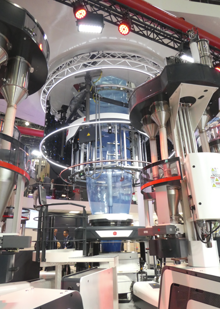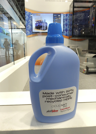Plastiblowは装置の展示と共に、50%のリサイクル材(PCR材)入りのボトルを多数展示し、目を引いていた。この装置は最大6層の共押出ボトルを製造でき、代表的な層構成は、内側HDPE/接着剤/バリア/接着剤/再生材/外側HDPEである。バリア材はほとんどの場合EVOHで、製品に応じて厚さを変化させる。肝心のPCR材入りのサンプルであるが、しっかりとしており、異物等の違和感はも見られなかった。