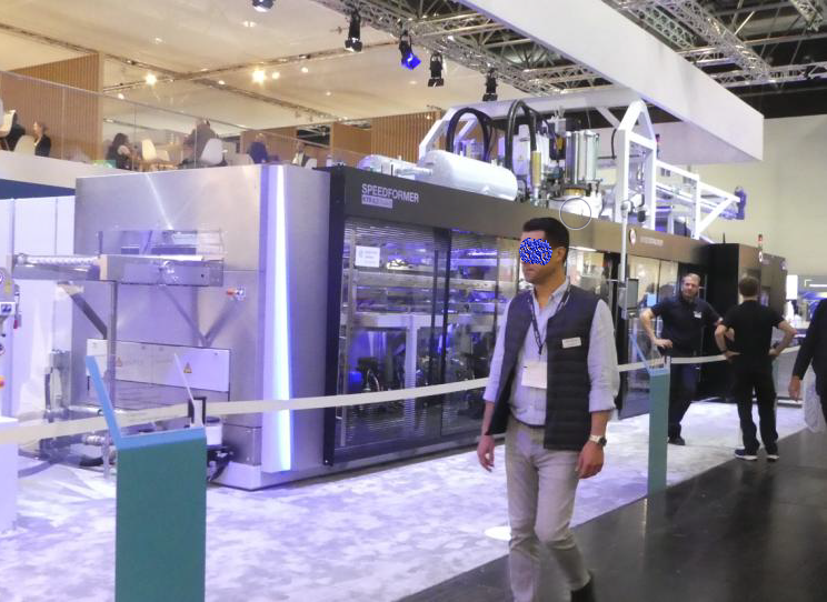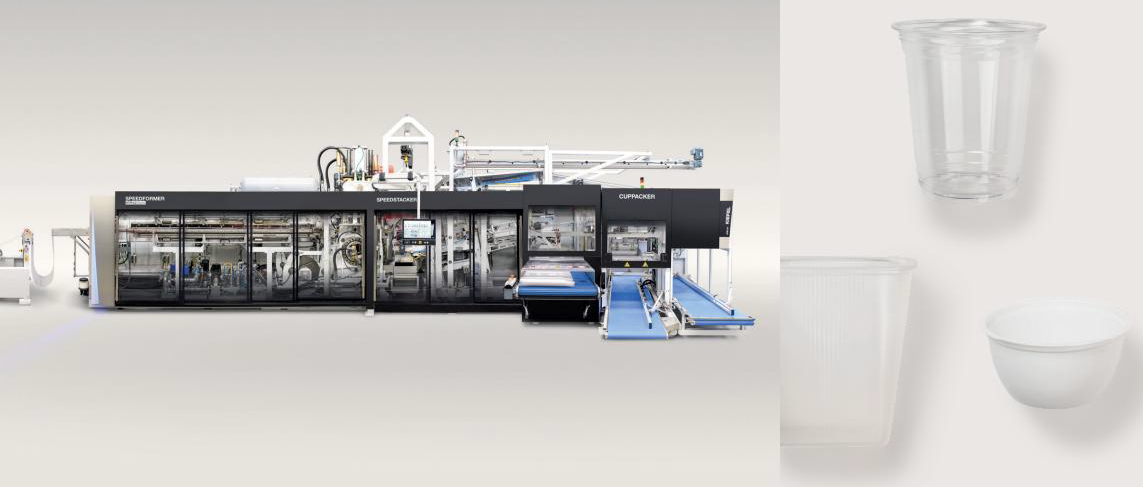 そのような中、同じブース内で、実演時の大きな音と大量にできる製品に驚く装置があった。ポリマーカップ、およびコーヒーカプセルの大量生産向け新型傾斜式成形機 の “SPEEDFORMER KTR 6.2 SPEED” である。