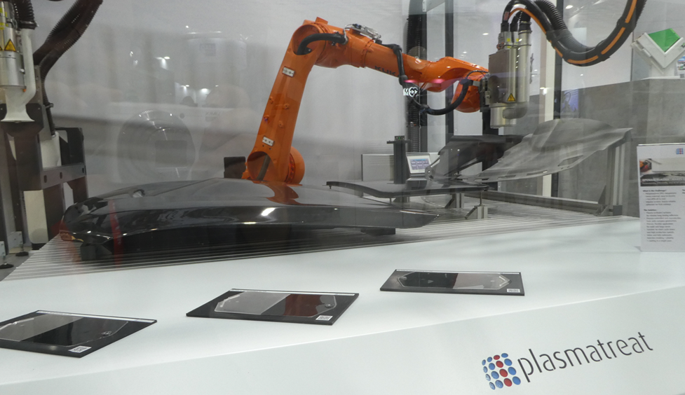 自動車業界では、軽量化でプラスチック化が進んでいるが、材料的には、PC+ABSのようなエンプラからポリプロピレン (PP) といった汎用樹脂の活用が広がりつつあるものの非極性であるため、PURが密着しにくいことが課題である。同社は、PP部品の射出成形後で、かつPURインモールドコーティング前の工程で、Openair-Plasma®を適用する方法を紹介しており、新開発の幅広プラズマノズルにより、フードなどの射出成形部品全体を短時間で前処理できると見せていた。表面粗さによる物理的な結合に加え、活性化された PP表面は PURコートシステムと化学的に結合し、強固な接着特性が得られる。デモンストレーションも車の部材をロボットが器用に動いて処理を施していた。