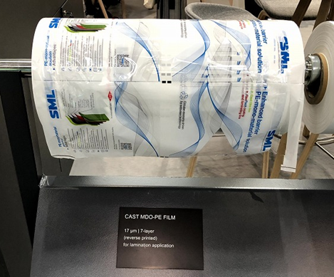サンプル展示のひとつとして、一軸に少し延伸したCAST-MDO-PE フィルムのロール状サンプルを展示していた。17μm厚の7層タイプのもので、写真6は裏印刷されたロールの例である。