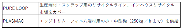 ・ポストコンシューマーPO(フィルム・硬質):INTAREMA、TVEplus、DuaFil 、Compact、ReFresher(脱臭)など。